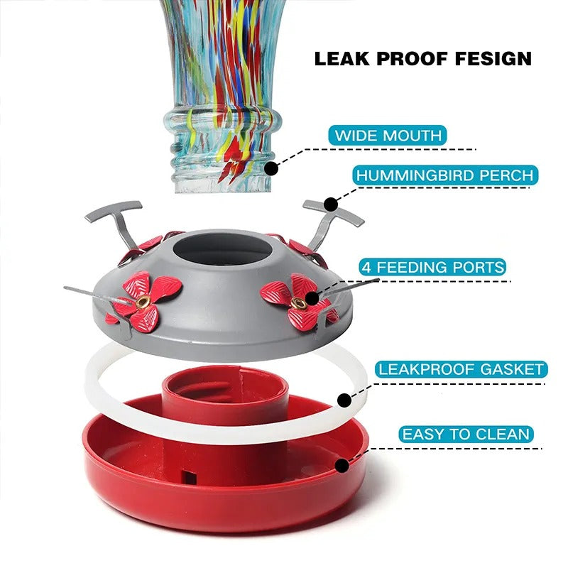 The translucent glass bottle and wide mouth of the hummingbird feeder make it easy to see the volume and fill the nectar in a timely and convenient way. The base is tightly sealed with a leak-proof gasket to prevent nectar from leaking out.