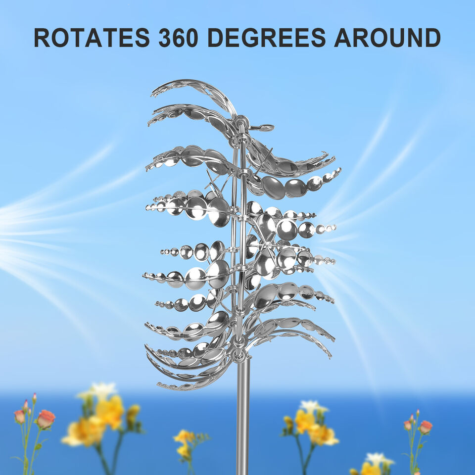 The metal wind spinner has a brushed coated surface and a stabilizing stake on the base, which can withstand all kinds of weather and is durable on windy days.